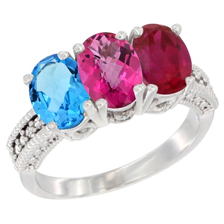10K White Gold Natural Swiss Blue Topaz, Pink Topaz & Enhanced Ruby Ring 3-Stone Oval 7x5 mm Diamond Accent, sizes 5 - 10
