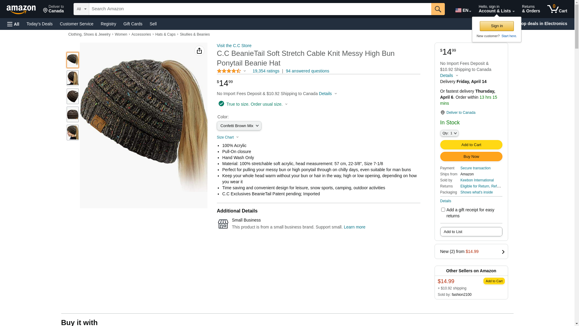 C.C BeanieTail Soft Stretch Cable Knit Messy High Bun Ponytail Beanie Hat, Confetti Brown Mix