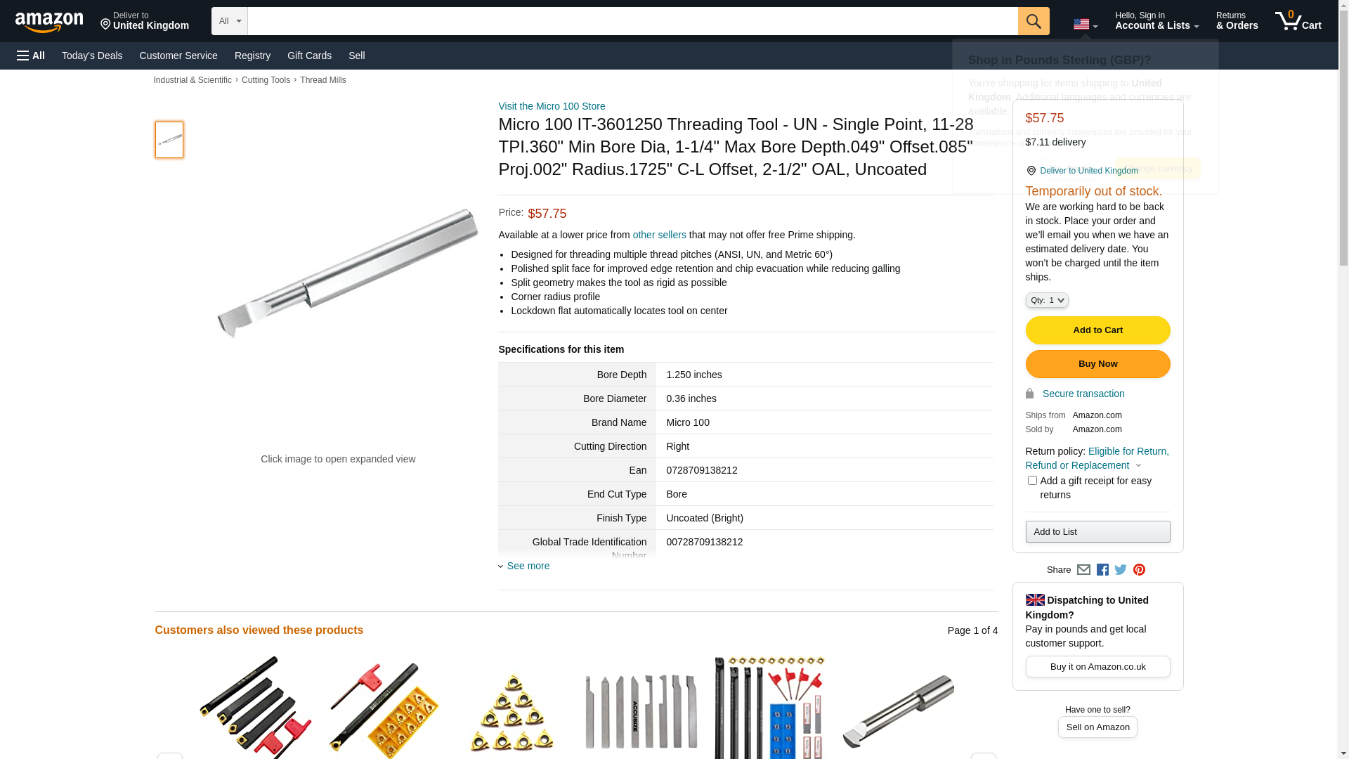 Micro 100 IT-3601250 Threading Tool - UN - Single Point, 11-28 TPI.360" Min Bore Dia, 1-1/4" Max Bore Depth.049" Offset.085" Proj.002" Radius.1725" C-L Offset, 2-1/2" OAL, Uncoated