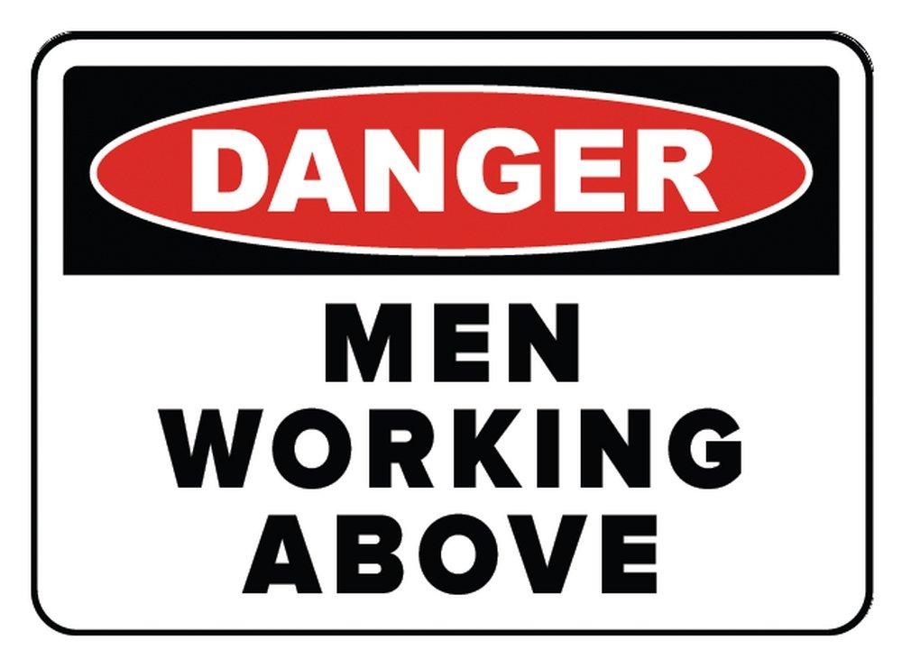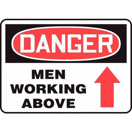 10" x 14" Adhesive Vinyl OSHA Sign: "Danger Men Working Above Up Arrow" Raise awareness to the potential of over head hazards from men working. Adhesive Vinyl (VS) Self-stick custom signs. Adhesive Vinyl is a moisture-resistant custom sign material that adheres to almost any flat surface. Adhesive vinyl signs will work for short term outdoor applications, and in moderate temperatures.