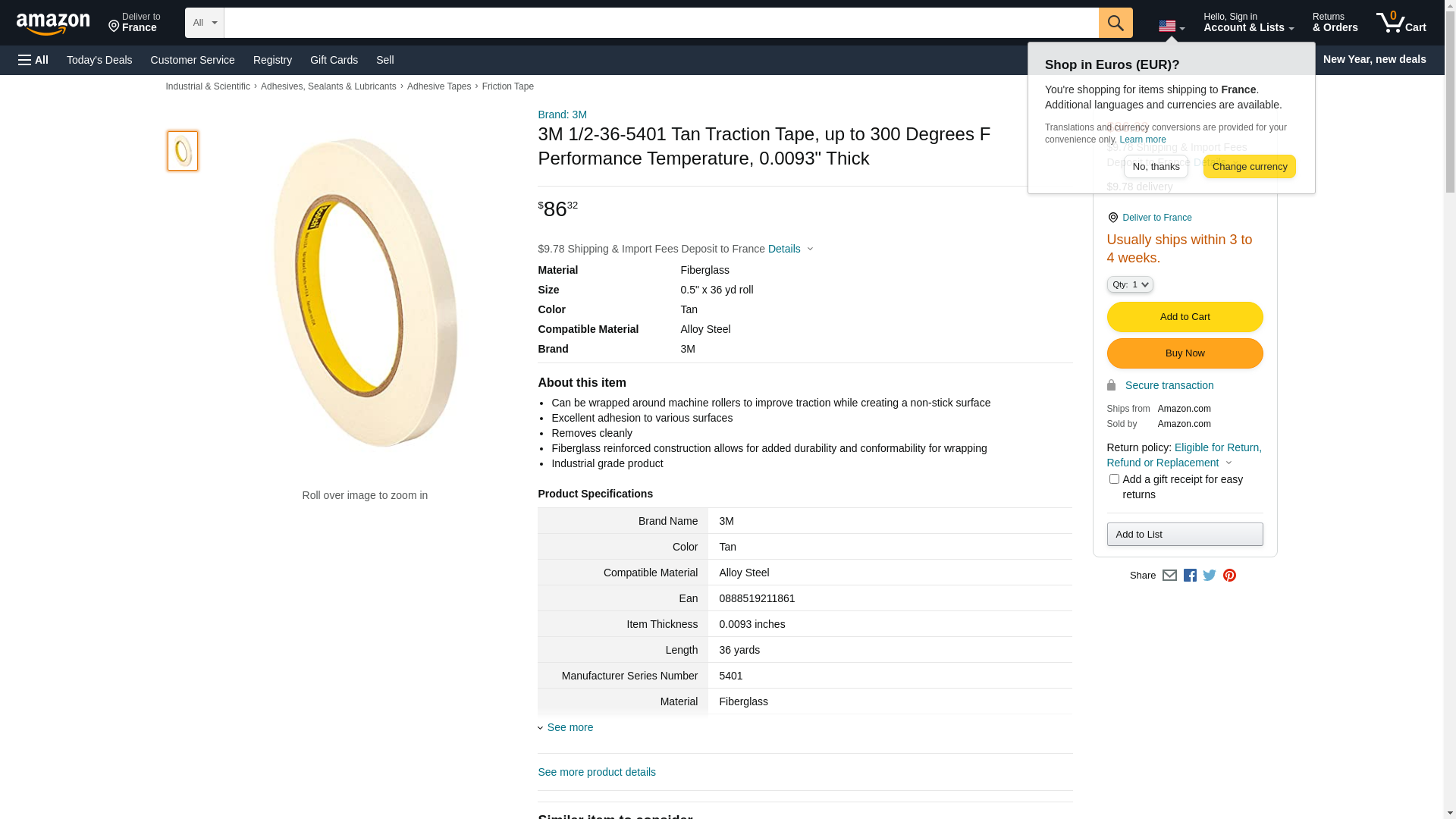 3M 1/2-36-5401 Tan Traction Tape, up to 300 Degrees F Performance Temperature, 0.0093" Thick