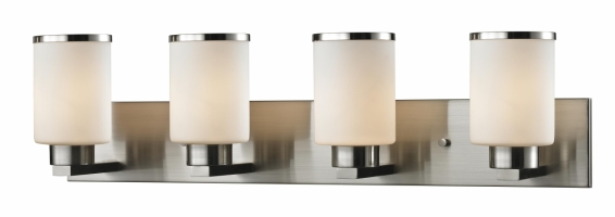 - The 4 light vanity has a Matte opal glass shades and it is accented with Brushed Nickel to achieve a soft elegance