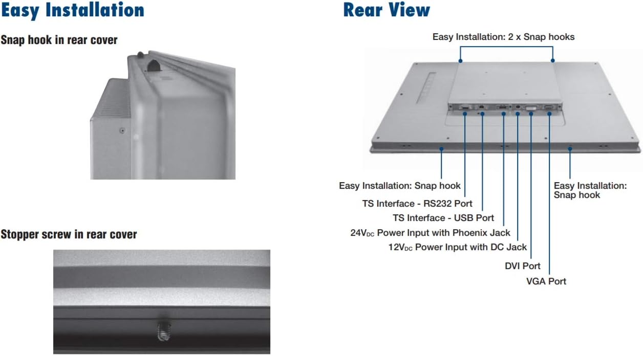 - Slim type design for Panel mount / Wall mount easy installation, Supports industrial 24VDC power input, Supports panel, wall, desktop and VESA arm mounting