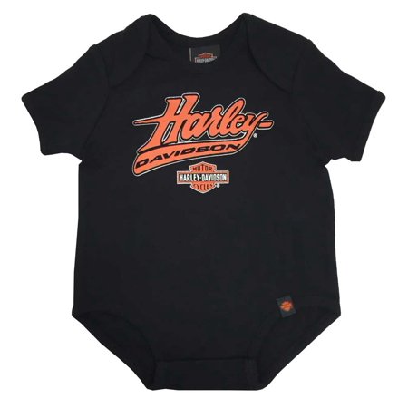 Harley-Davidson Baby Boy's Newborn Interlock Creeper, 0253094. Front features a super cute black felt "Harley-Davidson" script. Three snap bottom closure. Super soft creeper, made of 100% cotton. Perfect for your little Harley guy! <p></p> <ul> <li>Harley-Davidson Baby Boys' Newborn Interlock Creeper</li> <li>Features a super cute black felt "Harley-Davidson" script</li> <li>Three button bottom closure</li> <li>Made of 100% cotton</li> <li>Black</li> </ul><p>Country of Origin: Imported