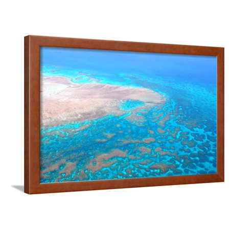 <ul> <li>Title: Great Barrier Reef, Cairns Australia, Seen from Above</li> <li>Artist: dzain</li> <li>Paper Type: Photographic Print</li> <li>Product Type: Framed Art Print</li> <li>Framed in SOHO Pecan</li> <li>Arrives ready-to-hang for fast, simple installation</li> <li>Framed Size: 26x18 in.</li> <li>Handcrafted in the USA</li> </ul>