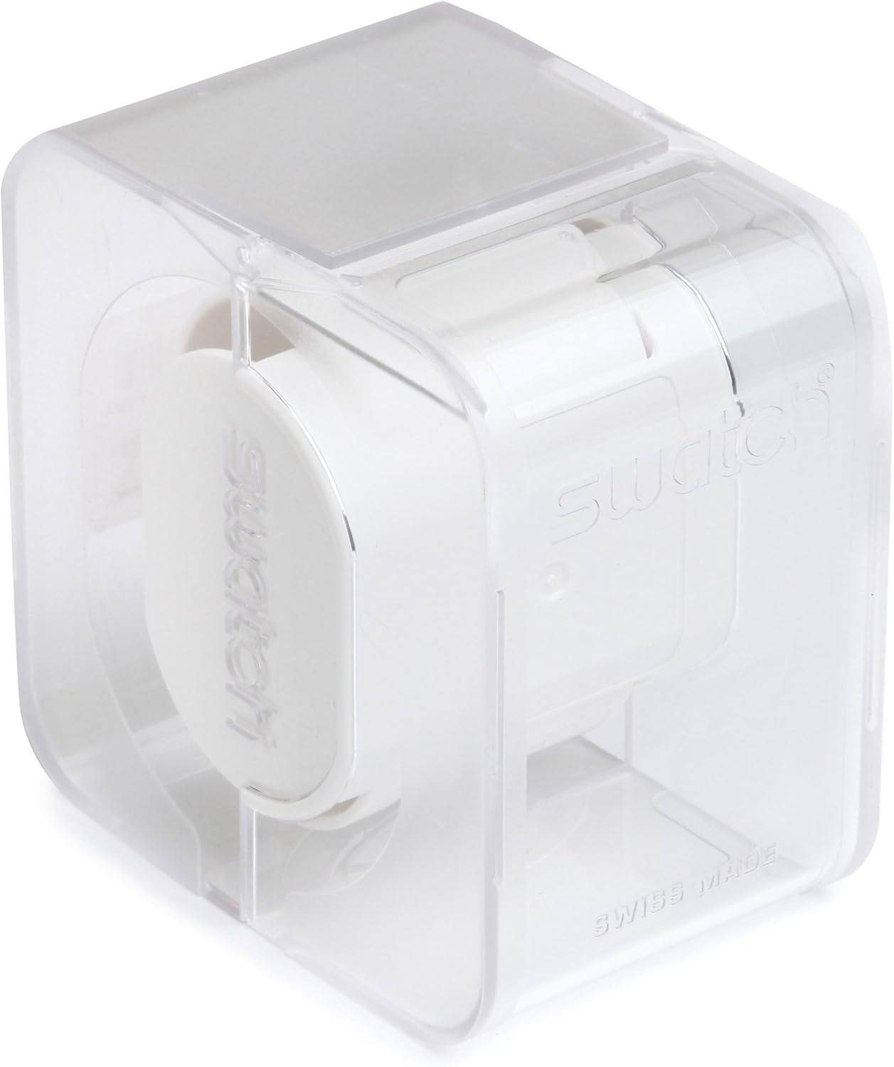 Transparent plastic case with a transparent plastic strap. Fixed gold aluminium bezel set with crystals. White dial with gold-tone hands and crystal hour markers. Minute markers around the outer rim. Dial Type: Analog. Date display between the 8 and 9 o'clock positions. Chronograph - three sub-dials displaying: 60 second, 60 minute and 1/10th second. Quartz movement. Plexiglass crystal. Pull / push crown. Solid case back. Round case shape. Case size: 43 mm. Case thickness: 12.8 mm. Band width: 22mm. Deployment clasp. Water resistant at 30 meters / 100 feet. Functions: chronograph, date, hour, minute, second. Dress watch style. Watch label: Swiss Made. Swatch Full-Blooded Marvelous Yellow Transparent Plastic Ladies Watch SVCK4068AG.