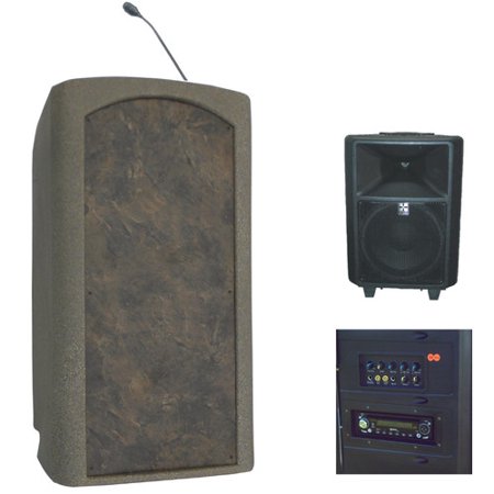 SMLC1014 <br /> <b>Features</b> <br /> <ul> <li>Comfortable padded wrist rest</li> <li>Rounded corners to help prevent damage</li> <li>Tilt back wheels for easy relocation to different venues or rooms</li> <li>Speaker stand extends to 76'' and can safely hold 132 pounds</li> <li>Made in the USA</li> <li>Freedom collection</li> <li>Product Type: Full podium</li> <li>Style (Old): Modern</li> <li>Primary Material: Plastic</li> <li>Powered: Yes</li> <li>Wheels Included: Yes</li> <li>Clock Included: Yes</li> <li>Reading Light Included: Yes</li> <li>Sound System Included: Yes</li> <li>Country of Manufacture: United States</li> </ul> <br /> <b>Dimensions</b> <br /> <ul> <li>Speaker: 24'' H x 17'' W x 12'' D, 68 lbs</li> <li>Overall Height - Top to Bottom: 47"</li> <li>Overall Width - Side to Side: 26"</li> <li>Overall Depth - Front to Back: 25.5"</li> <li>Overall Product Weight: 116 lbs</li> </ul> <br /> <b>Specifications</b> <br /> <ul> <li>Commercial ONLY Certifications: Yes</li> <li>Commercial OR Residential Certifications: Yes</li> </ul>