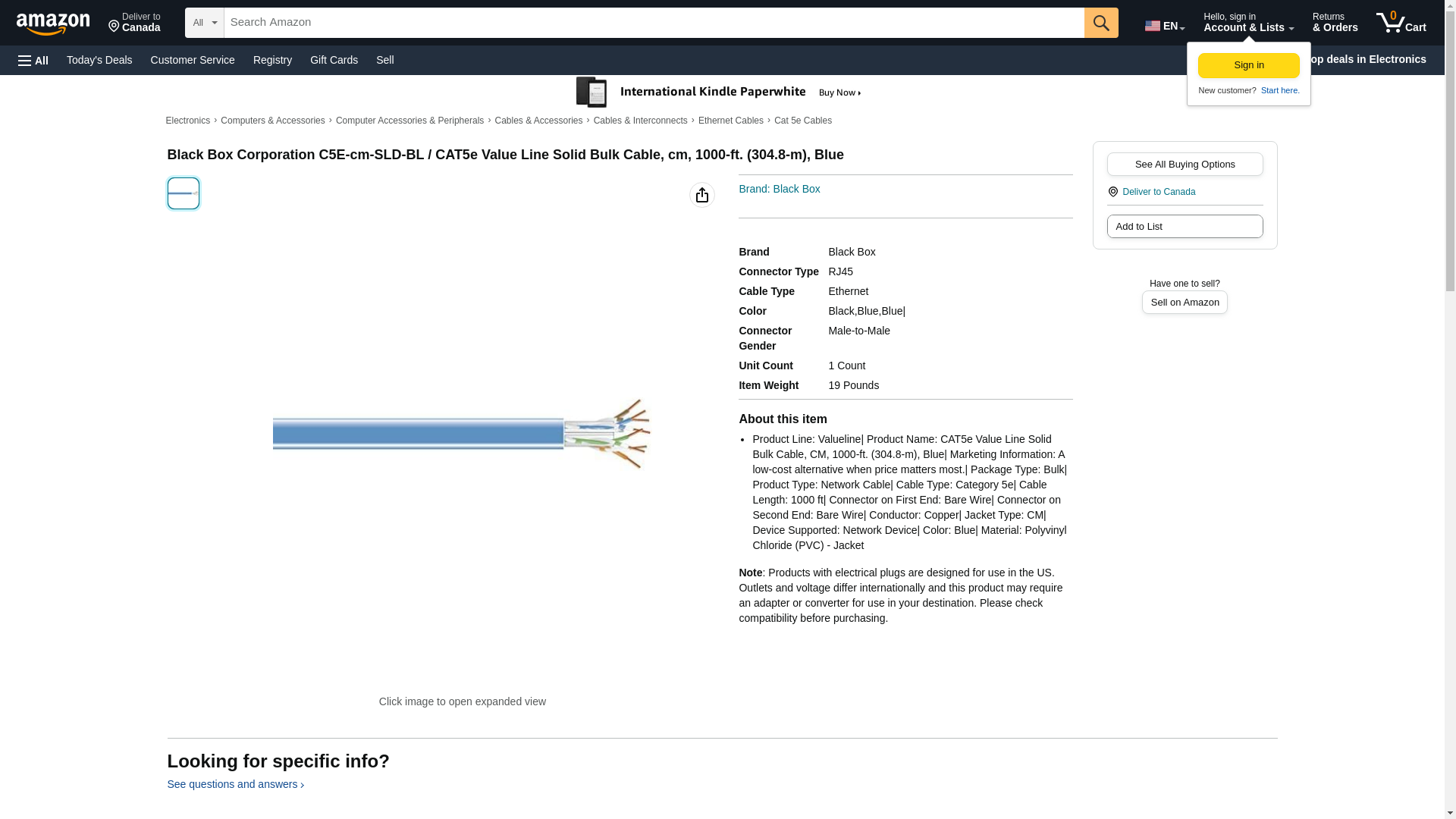 - Product Line: Valueline| Product Name: CAT5e Value Line Solid Bulk Cable, CM, 1000-ft. (304.8-m), Blue| Marketing Information: A low-cost alternative when price matters most.| Package Type: Bulk| Product Type: Network Cable| Cable Type: Category 5e| Cable Length: 1000 ft| Connector on First End: Bare Wire| Connector on Second End: Bare Wire| Conductor: Copper| Jacket Type: CM| Device Supported: Network Device| Color: Blue| Material: Polyvinyl Chloride (PVC) - Jacket