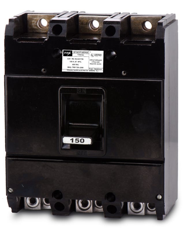 As an Amazon Associate, we earn from qualifying purchases. Federal Pacific NJL631150 3 Pole Circuit Breaker Federal Pacific . NJL631150-R Gallery Attributes Brand name, Manufacturer name, Manufacturer, Attribute00Federal Pacific Attribute01NJL Attribute02, Voltage600 Attribute03, Attribute043 Attribute05Bolt-On Attribute06Magnetic Attribute07, MPN, SKUNJL631150-R AttributeKey00Brand AttributeKey01Series AttributeKey02Voltage AttributeKey03Poles AttributeKey04Phase AttributeKey05Mounting Type AttributeKey06Contactor Type AttributeKey07Mpn CategoryL1Federal Pacific NJL631150 3... Extra Product NameFederal Pacific NJL631150 3 Pole Circuit Breaker moq, multiple1 qtyInStock0 snippetNJL631150 - Federal Pacific Bolt-On Molded Case Breaker Federal Pacific NJL series three pole 150 ampere bolt-on molded case circuit breaker with maximum voltage rating of 600V tripping method thermal magnetic and standard interrupting rating of 30 kiloampere at 480V complete with non-interchangeable trip (LI) long-time and instantaneous trip functions and load side lug terminals. Distributor offers SellerSKUMOQIn stockMultiplePrices superbreakers.comNJL631150-R11