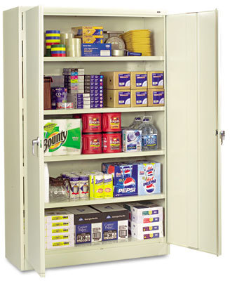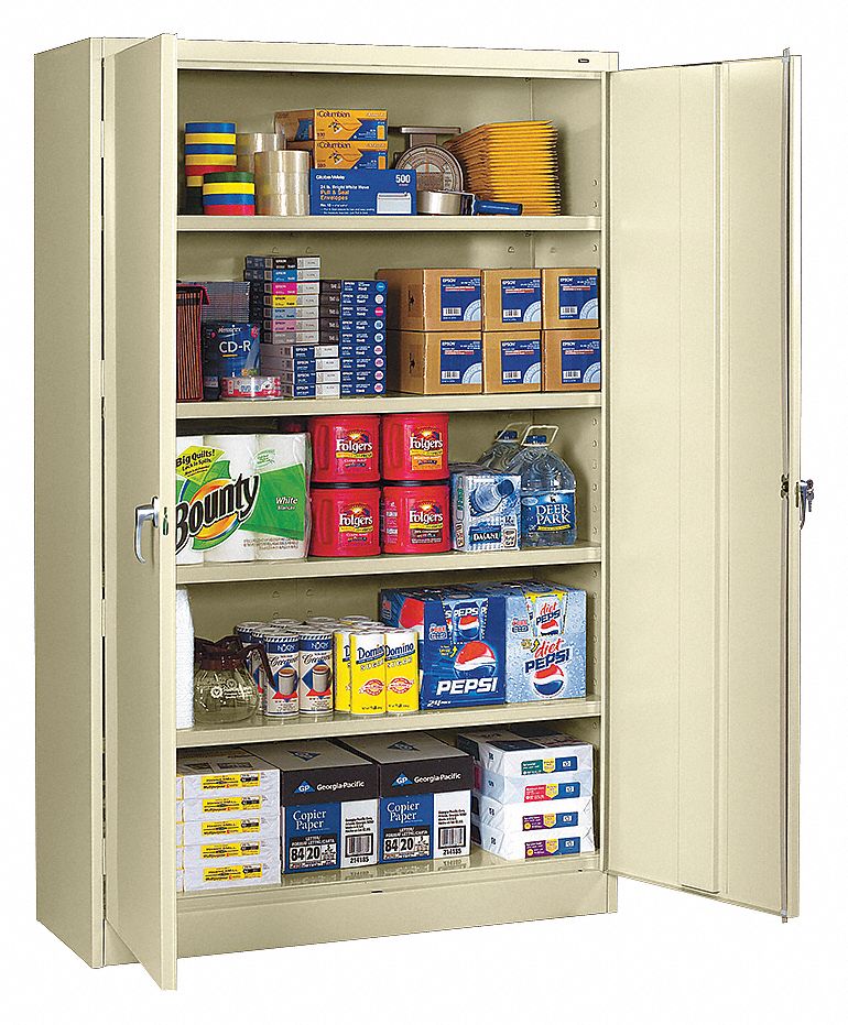 Extra-large capacity for 13 cu. ft. more storage space than standard width cabinets. Heavy-gauge welded steel and sturdy box-formed construction. Four adjustable shelves with built-in support tabs hold up to 400 lbs. each. Heavy-duty leaf hinges and secure three-point locking system. Two brushed chrome handles, with one that locks both doors, make opening and closing easy. Raised cabinet base with integrated levelers to help compensate for uneven floors. Color: Putty; Overall Width: 48"; Overall Depth: 18".