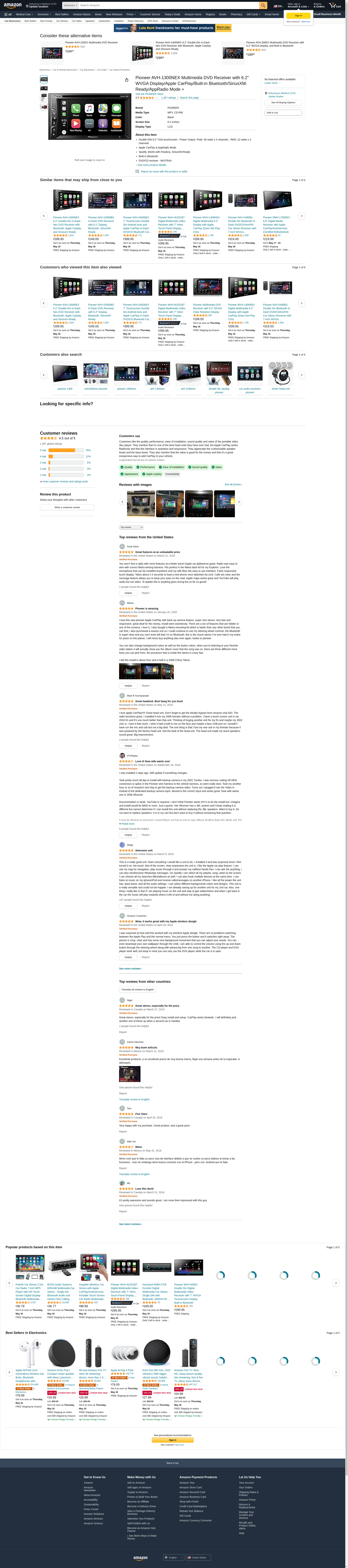 Pioneer AVH-1300NEX Multimedia DVD Receiver with 6.2" WVGA Display/Apple CarPlay/Built-in Bluetooth/SiriusXM-Ready/AppRadio Mode +