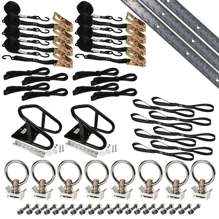 This double motorcycle tie down kit is designed to fit perfectly in the bed of a 6' pick-up truck or in a small trailer and will accommodate two motorcycles loaded side-by-side. It includes enough L-track, tie down rings and fasteners to create three 6-foot lengths of adjustable anchor points. Also included are eight motorcycle ratchet straps, eight soft loop handle bar straps, and eight cinch straps. Two wheel chocks make it easier to position the bikes when tying down.Kit includes: 3 - 72" Aluminum L-track tie down rails 8 - Aluminum single stud ring fittings 20 - 1-1/2" Bolts w/ nut & washer 8 - Black motorcycle handlebar soft loop strap 8 - 1" x 6' Black motorcycle ratchet strap w/ S-hooks 8 - Black cinch strap 2 - Motorcycle wheel chock