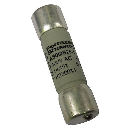 'Semiconductor Fuse, 25A, 300VAC, 300VDC, A30QS Series, Nonindicating, Fast Acting, Body Style Bolt-On, Nonrejection, Interrupt Rating 200kA at 300VAC, 100kA at 300VDC, Fuse Size 2 In. L x 9/16 In. dia., Length 2 In., Width Not Applicable, Depth Not Applicable, Diameter 9/16 In., Equivalent Brand and Series Bussmann FWX, Littelfuse L25S, Mersen A30QS, Equivalent Series A30QS, FWX, L25S, Body Material Ceramic, Single Element, Standards CE, UL Recognized, Guide JFHR2, CSA Approved'