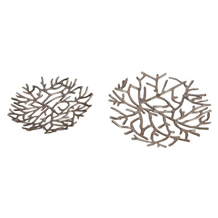 A set of two silver bowls with an elegant twig pattern. Solid cast aluminum with a nickel finish.