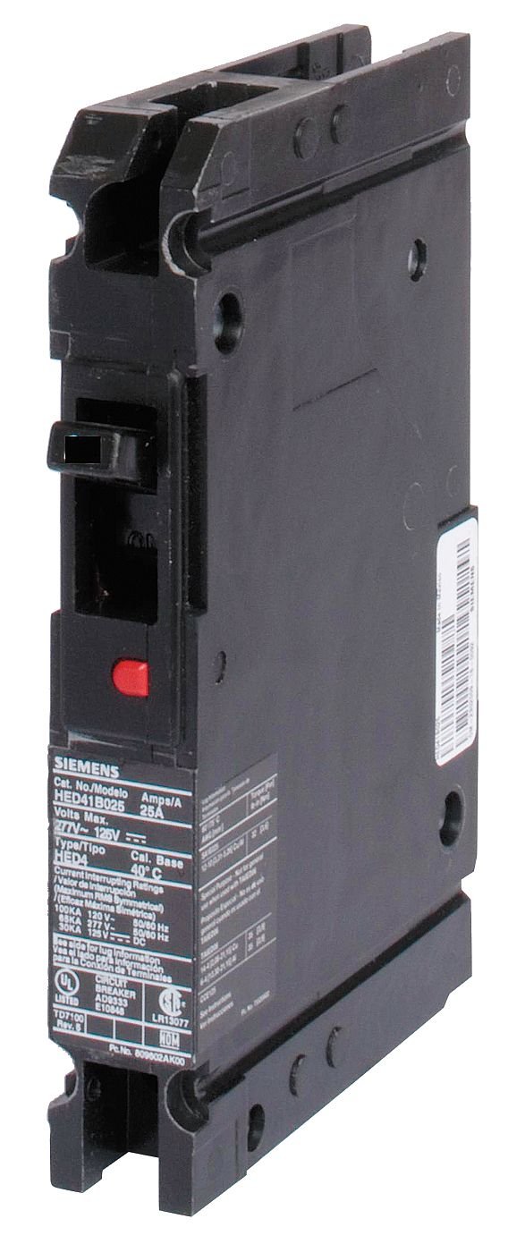Technical Specification Item Molded Case Circuit Breaker Amps 45 AC Voltage Rating 277VAC Max. AIR Rating 25kA at 277VAC For Use With Sentron Panelboards, SB Switchboards Series HED4 High Amp Trip Setting 45A Low Amp Trip Setting 45A Circuit Breaker Type Standard Number of Poles 1 DC Voltage Rating 125VDC Terminal Connection Load Side Lug Trip Type Thermal Magnetic Phase 1 Instantaneous Trip Fixed Phase Connection ABC Frame Size 125A/ED Circuit Breaker Mounting Style Lug In Panelboard Height 6.34 Width 1 Depth 4 Min. Wire Size 10 AWG Max. Wire Size 1/0 AWG Circuit Breaker Actuator Toggle Standards HACR Rated, UL Listed Compliance and Restrictions Hazardous material - General This item is restricted for international sale. This listing is for each. _DELETE_