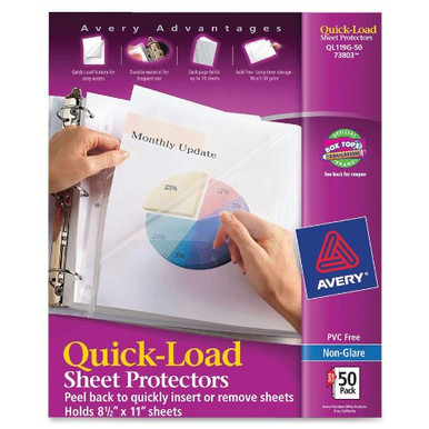Buy Avery Dennison AVE73803 As low as $11.46 in bulk In stock Avery Quick Load Sheet Protector - Letter 8.50" X 11" - Polypropylene - 50 / Box - Non-glare