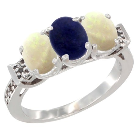 14K White Gold Natural Lapis & Opal Sides Ring 3-Stone Oval 7x5 mm Diamond Accent, sizes 5 - 10