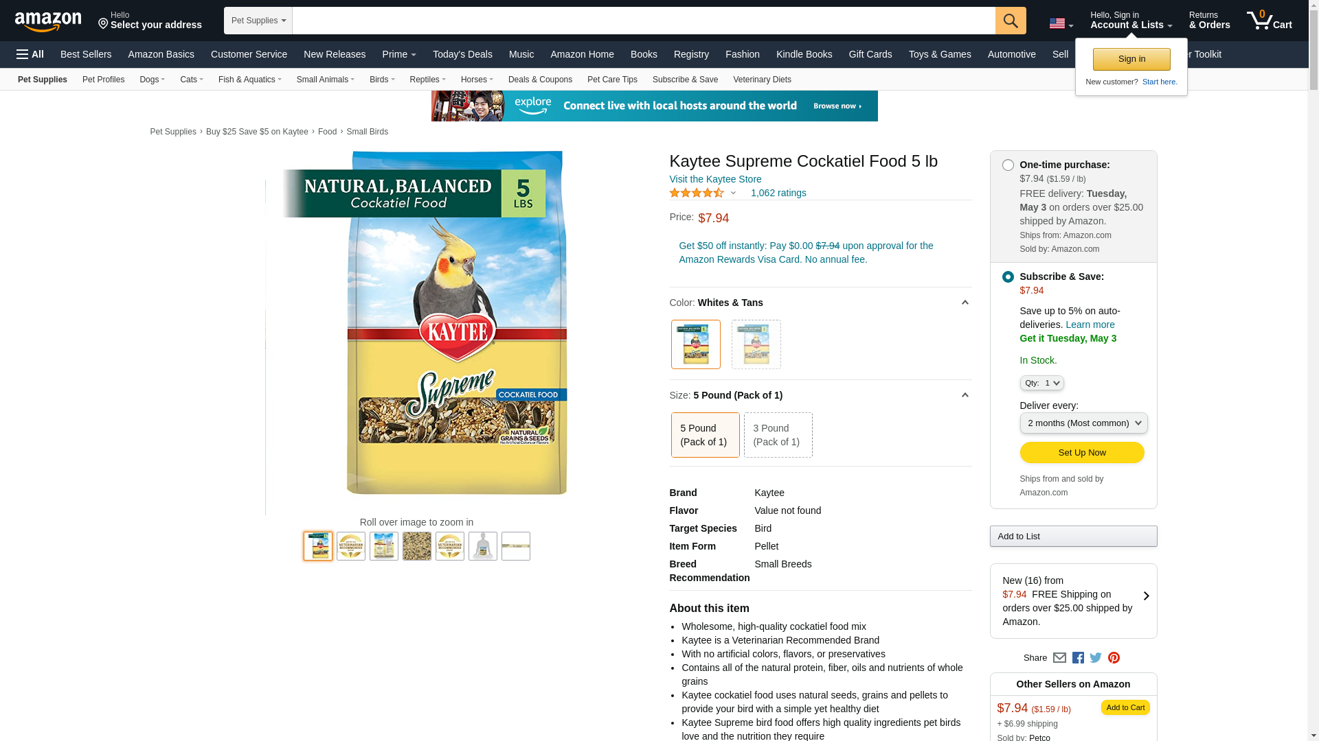 100034057 Pet type: Cockatiel, Size: 5 Pound Features: -Clean, wholesome, high-quality mix that contains all of the natural protein, fiber, oils and nutrients of whole grains. -Fortified to ensure a well-balanced blend. -High quality, nutritious ingredients in a mix that birds love. -Made in United States. Product Type: -Food. Suggested Breed: -Canary/Cockatiel/Finch/Parakeet/Parrot. Animal Type: -Bird. Primary Color: -Whites & Tans. Primary Color: -Greens. Primary Color: -Oranges. Generic Dimensions: -Canary / 2 lbs 1.5" H x 6.5" W x 10" D. -Cockatiel / Parrot / 25 lbs 4" H x 15" W x 29" D. -Cockatiel / 5 lbs 2" H x 10" W x 14" D. -Cockatiel / 3 lbs 1.5" H x 13.75" W x 8.5" D.