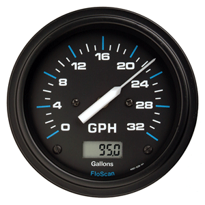 FLOSCAN 5510-20B-1 FLOWMETER A Series 5500 CruiseMaster Fuel Monitoring System will increase any boat's effective range by accurately recording total fuel consumed by pinpointing optimum speed. Now you can spend more time fishing or cruising knowing you have enough fuel to make it to port. CruiseMaster brings you more than peace of mind and increased cruising range, it also pays for itself in better fuel economy. Fits virtually all inboard, I/O, and gas outboard engines. Features Self contained Totalizer with permanent LCD display records fuel consumed up to 99,999 gallons. Resettable or non-resettable totalizer operating mode. SPST type switch required for resetting totalizer. Model 20B Flow Sensor with solid state signal generator for maintenance free use. Installs between tank and fuel pump. Model 231 Flow Sensor features extremely low flow resistance. Recommended for carbureted and 2-stroke EFI outboard engines 150 HP and over where system flow resistance should be minimized. Installs between priming bulb and fuel tank. Microprocessor-based electronics with user adjustable totalizer calibration for superior accuracy. Panel mounted instrument fits 3-1/16" diameter opening. Models available with 0-5, 0-10, 0-20, 0-32, 0 -50 , and 0-100 GPH scales. HP rating will determine the best GPH scale to use . Twin engine models show the individual flow rates to each engine with an external toggle switch. The totalizer records the fuel consumption of one or both engines and can be reset with an external toggle switch. Applications Fits all carbureted inboard and stern drive engines up to 350 hp. Fits all EFI inboard and stern drive engines (including Mercruiser and Volvo) with closed loop fuel return systems. Fits all Mercury Optimax, Evinrude E-TEC/Ficht , Yamaha HPDI, and Honda 4-stroke engines. Fits all 2-stroke EFI outboard engines.