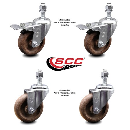 High Temp Glass Filled Nylon Swivel Threaded Stem Caster Set of 4 w/4" x 1.25" Brown Wheels and 12MM Metric Stems - Includes 2 with Total Locking Brake - 1400 lbs Total Capacity - Service Caster Brand