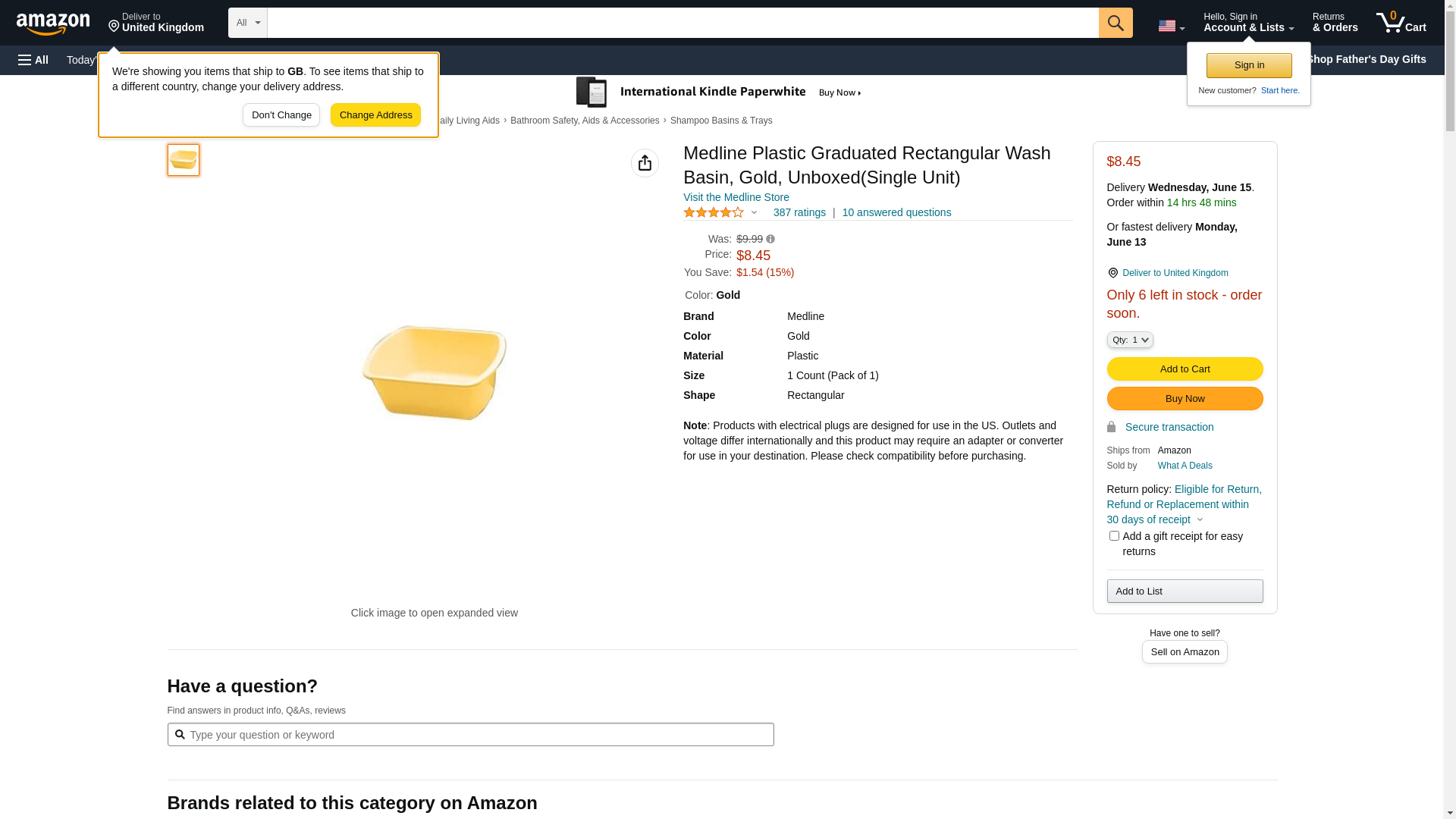 Medline Plastic Graduated Rectangular Wash Basin, Gold, Unboxed(single Unit)