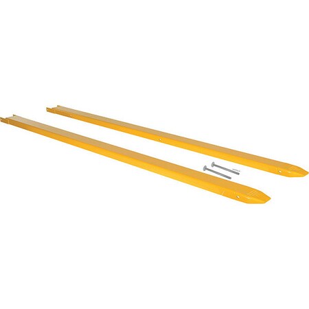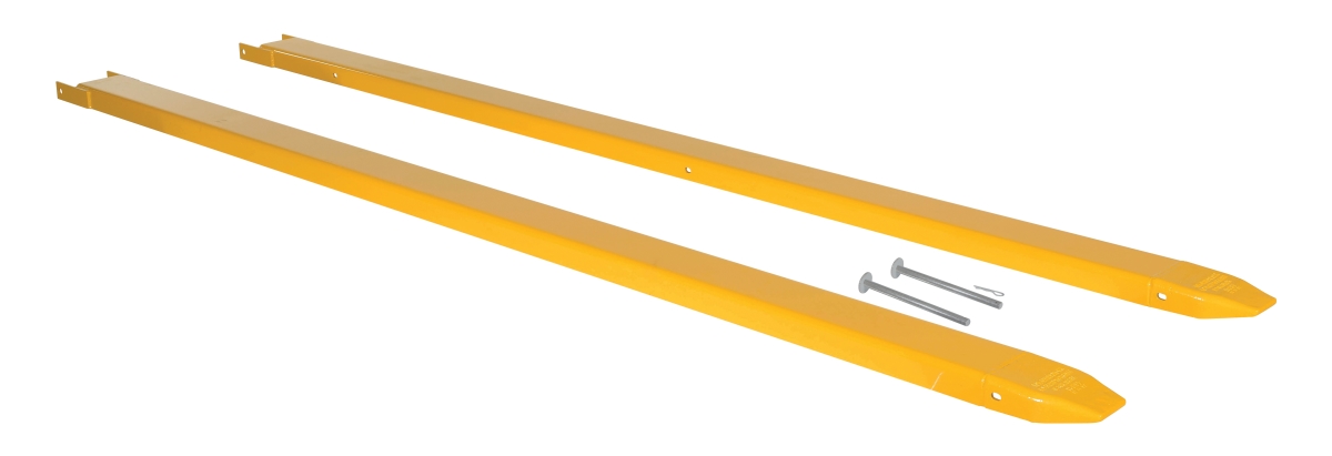 Provide the extra support needed to lift long or large objects with a fork truck using a pair of Fork Extensions. Welded steel construction with cast steel tips. Steel retaining strap prevents fork extensions from sliding off forks during use. Powder coat yellow finish. OSHA regulations require that extensions are no more than one-hundred and fifty (150) percent of the existing fork length. Remove pin and lay extension over fork or drive fork truck into the extension. Re-insert the pin behind the heel of the fork to secure extension. Limited Warranty: 30 days. Uniform Capacity Per Pair (lbs): 4,000, Usable Length (in.): 120, Fits Fork Extension Inside Height (in.): 2, Fits Fork Extension Inside Width (in.): 5, Usable Fork Extension Inside Width (in.): 5-1/2, Mount Style: Pin Style, Steel Thickness (in.): 5/16,