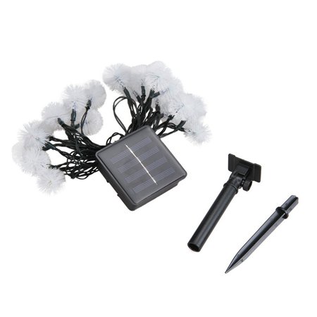 Approx. 5M. Solar Powered Chuzzle Ball LED lights, no wiring or external electricity required for use. <br />Power-saving and Eco-friendly. <br />Light turns on automatically when dark, also controlled by manual on/off switch;Two modes to choose. <br />Long bright/ Single flash. <br />Solar powered panel can set up by a 20cm removable spike. <br />Automatic & Durable <br />Unique optical technology can guarantee the lights (when brightly light) automatically charge during the day, and in the evening (when insufficient light) automatic light up. <br />It also has the characteristics of easy installation, waterproof sunscreen and other characteristics.(LED light strings are waterproof, but solar panel need transparent plastic bag cover if use outside in case of raining) <br />Solar powered panel can set up by a 20cm removable spike. <br />With ON/OFF, MODE switches. <br />Products are widely used in road, yard, window, the place such as shops, hall, stage, especially for the Christmas tree decoration <br />Ideal for decorating your gardens, patio, lawn, porch, gate, yard, also ideal for indoor decoration. <br />Manufacturer Specifications <br />Type: Low-power LED decorative lights <br />Color: MultiColor <br />Switch: 2 (Power ON/OFF& MODE) <br />Control method: light-operated + buttons <br />Flash mode: Long bright+single flash <br />LED quantity: 20pcs, 20 LED at 0.15M spacing <br />Lead length: 2M <br />Lamp spacing: 0.15M <br />Color temperature: 3000-12000k <br />Rated voltage: 3v <br />Power: 1.2w <br />Beam angle: 90-135 degree <br />Charging time: 6 hours <br />Working time: 8-10 hours, total working time more than 10,000 hours <br />Working temperature: -20 -60 <br />Package Contents: 1 x 20 LED Solar Light String <br />1 x Removable Stand <br />Note:Light shooting and different displays may cause the color of the item in the picture a little different from the real thing. The measurement allowed error is +/- 1-3 cm.