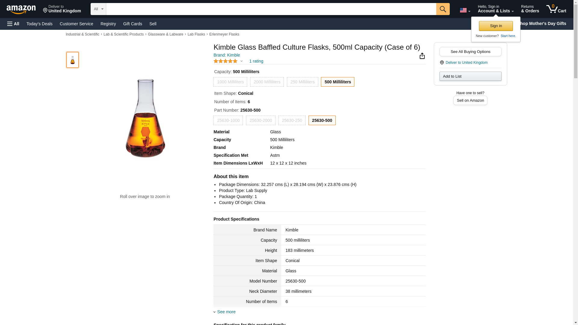 | Feature | KIMBLE - Flask- Culture- Baffled Shake- 500ML , CS6 |