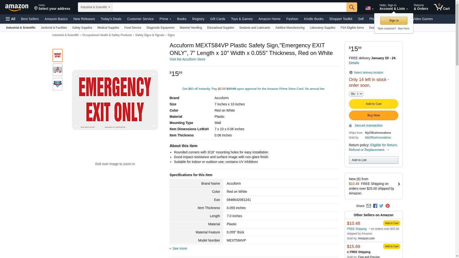 7" x10".055" thick Plastic. EMERGENCY EXIT ONLY. Rounded corners with 3/16" mounting holes for easy installation. Good impact resistance and surface image with non-glare finish. Indoor or outdoor, contains UV inhibitors. Manufactured with 50% recycled plastic and is recyclable (Code 2).