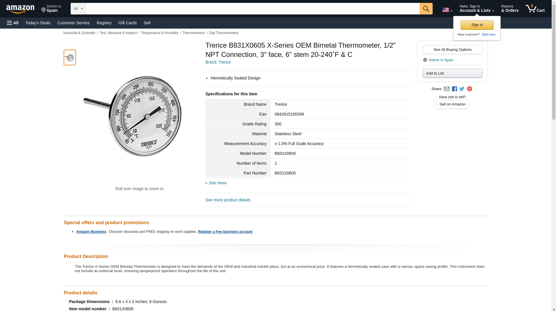 Trerice B831X0605 X-Series OEM Bimetal Thermometer, 1/2" NPT Connection, 3" face, 6" stem 20-240˚F & C
