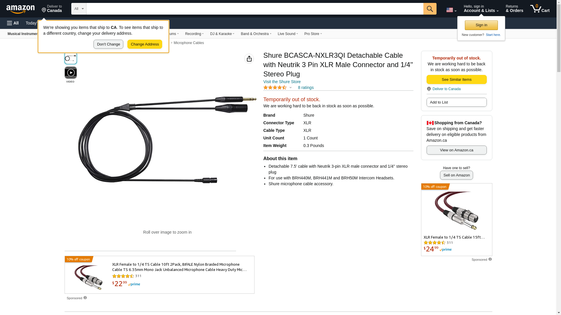 Shure BCASCA-NXLR3QI Detachable Cable with Neutrik 3 Pin XLR Male Connector and 1/4'' Stereo Plug
