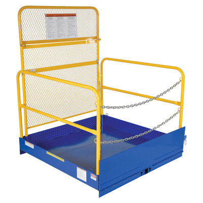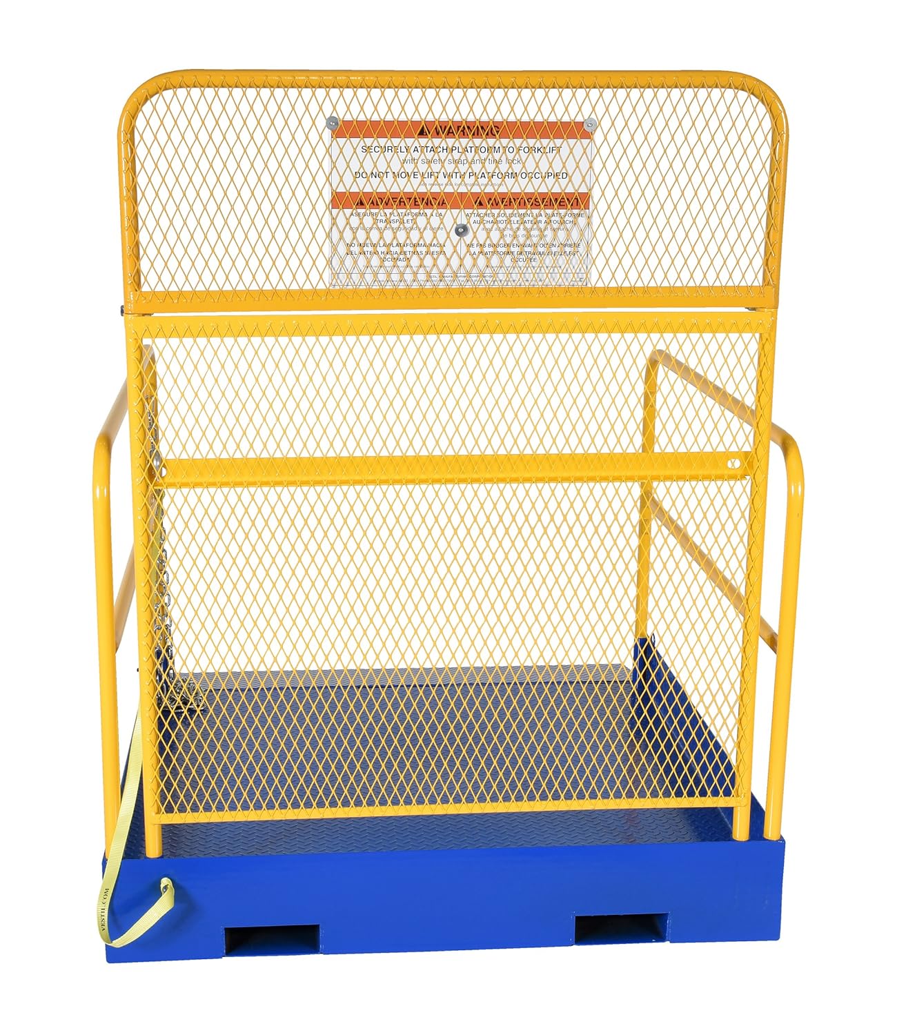 - Checker plate floor for extra traction and safety strap to secure platform to fork truck