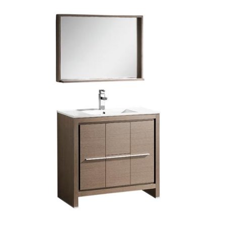 The Fresca 36-inch Allier is a sleek, modern free standing vanity with plenty of storage space. This set is accented nicely with a matching mirror with small shelf with a perfect balance of hues and textures. <br /> <br /> <ul> <li>Materials: Plywood with veneer</li> <li>Finish: Grey</li> <li>Ceramic countertop/sink with overflow</li> <li>Single hole faucet mount</li> <li>Fresca Bevera Faucet</li> <li>(2) two doors, (2) two drawers, (1) one shelf </li> <li>P-trap</li> <li>Pop-up drain</li> <li>Installation hardware</li> <li>Mirror dimensions: 35.5 inches wide x 25.25 inches high x 6 inches deep</li> <li>Vanity dimensions: 35.375 inches wide x 18.5 inches deep x 33.5 inches high</li> </ul>