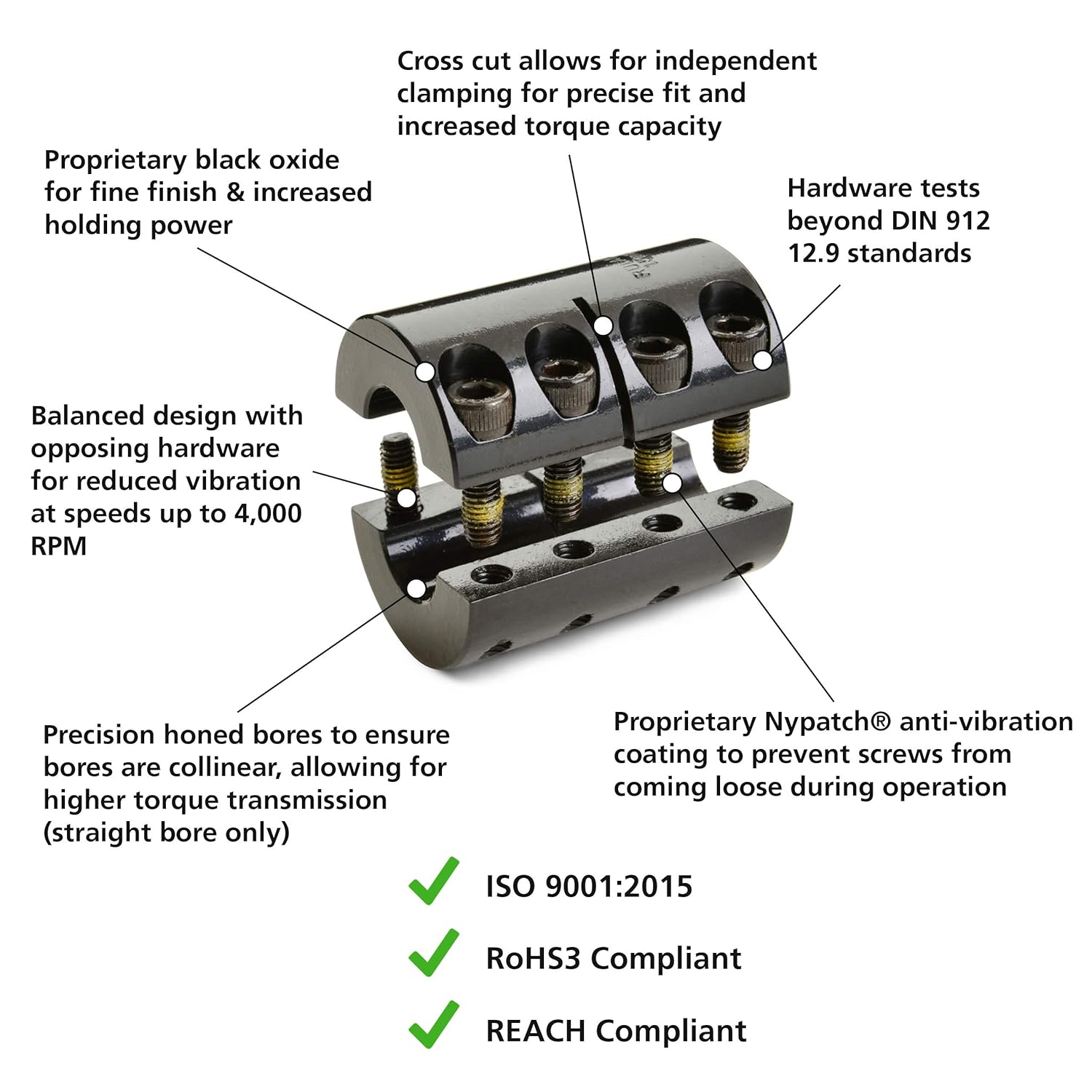 - Precision honed bores on straight bore couplings for superior fit and torque transmission. Does not mar the shaft. Two-piece styles have opposing hardware for a balanced design.