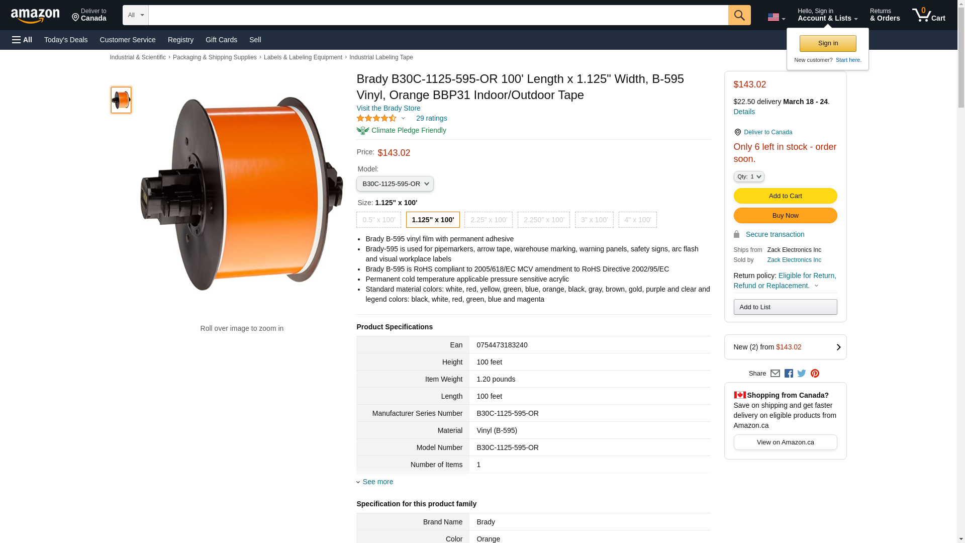 Brady - B30C-1125-595-OR - Orange Vinyl Film Label Tape Roll, Indoor/Outdoor Label Type, 100 ft. Length, 1-1/8 Width