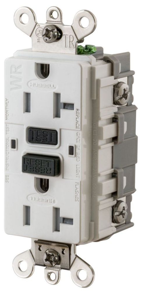 'GFCI Receptacle,20 Amps,NEMA Configuration 5-20R,Outlet Type Duplex,Commercial Grade,Tamper Resistant Yes,Weather Resistant Yes,Outlet Style Decorator,1 HP,Voltage 125,White,LED Yes,Heavy Duty,Number of Poles 2,Number of Wires 3,Reset Type Reset After Trip,Features Self Test,Standards UL Fed Spec & CSA'