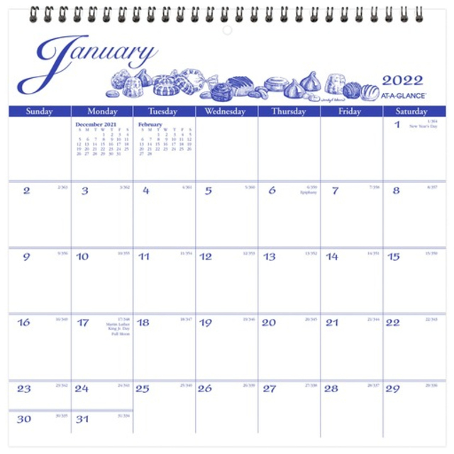 Monthly wall calendar features a new illustration each month and offers the essentials to manage your schedule. Dated planning pages range 12 months from January to December. One-page-per-month format offers generous writing space in each unruled daily block (1-3/4" x 1-5/8"), count of days/days remaining, and past and future months reference. Wirebound wall calendar also offers a heavyweight, gray backboard frame and punched center hole for easy hanging. Calendar is printed in blue ink on quality recycled paper.
