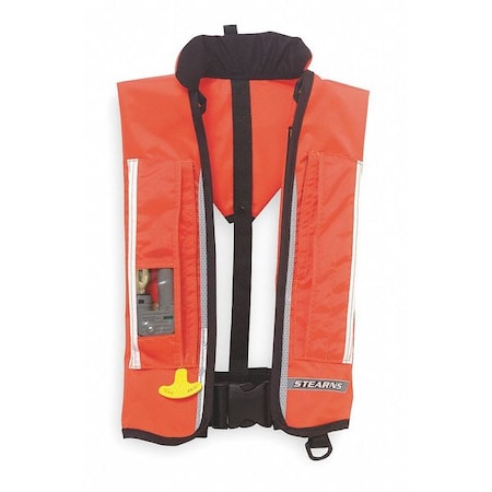 Ultra commercial-automatic vestManufactured By: StearnsAutomatic inflation when submerged in water, manual inflation by pulling lanyard or by oral tube.Halkey-Roberts 1F automatic inflator with single-point indicator.Features high-visibility reflective tape, emergency whistle on bladder, clear window to view arming status, pocket to store extra cylinder, gear and D-ring.Heavy-duty nylon outer shell with 3M Scotchlite Reflective Material, SOLAS-grade 6755 on front and 2” adjustable belt for secure fit.Tri-fold design provides comfortable fit and easy repacking.33.7 lb.(150 Newton) buoyancy when fully inflated.Adult universal.USCG Approved Type V for use when worn on uninspected commercial vessels less than 40' in length, not carrying passengers for hire.Approved substitute for a Type ll or lll PFD only when worn and used in accordance with the owner's manual.