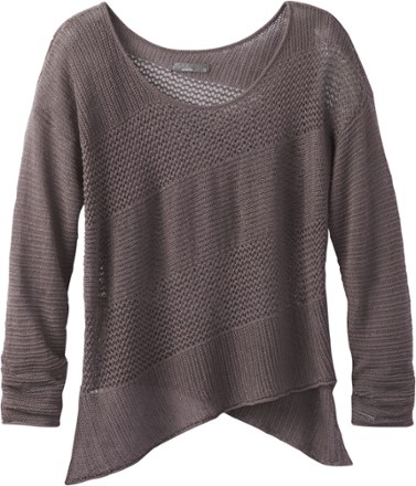 The prAna Liana sweater is naturally beautiful with its wide neck, angled stripes, sheer fabric and asymmetric hem, offering a casual, feminine silhouette.