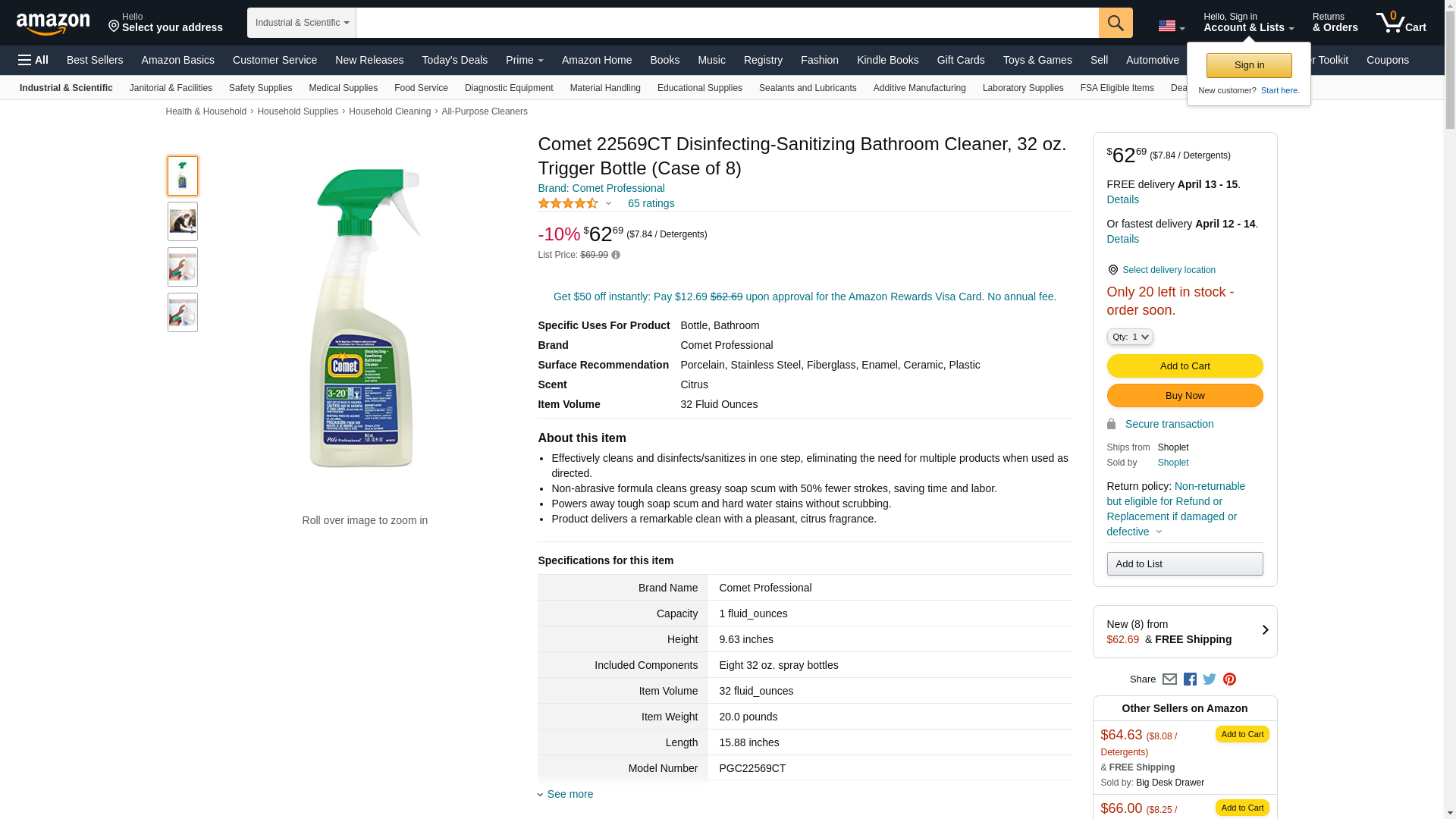 Comet 22569Ct Disinfectant Bathroom Clnr, Trigger Bottle, 32Oz, 8/Ct, We