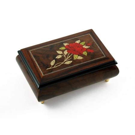This breath taking hand crafted musical jewelry box is a stunning addition to our extensive Italian floral themed boxes. The break taking design displays a elegant single red rose inlay against the natural warm tones of the natural burl elm. The flower is gently placed inside a dark rosewood border .<br><br>Inside you'll find an open compartment and ring roll for your precious keepsakes. Everything is harmoniously pieced together by the wonderful sound omitting from the traditional mechanical movement mounted inside. <br><br>This item can be fitted with higher note options. Please refer to the individual item listing for pricing. <br><br>With over 380+ tunes available, your sure to find that perfect melody. Please see "item options" for available tunes or visit our "listening station" for all song titles as well as sample clips. <br><br>Thank you very much for your interest in our products! Your satisfaction is always guaranteed at the Attic!<br><br>Dimensions: <br><br>Length - 6.5" Width - 4.5" Depth (Height) - 2.75"