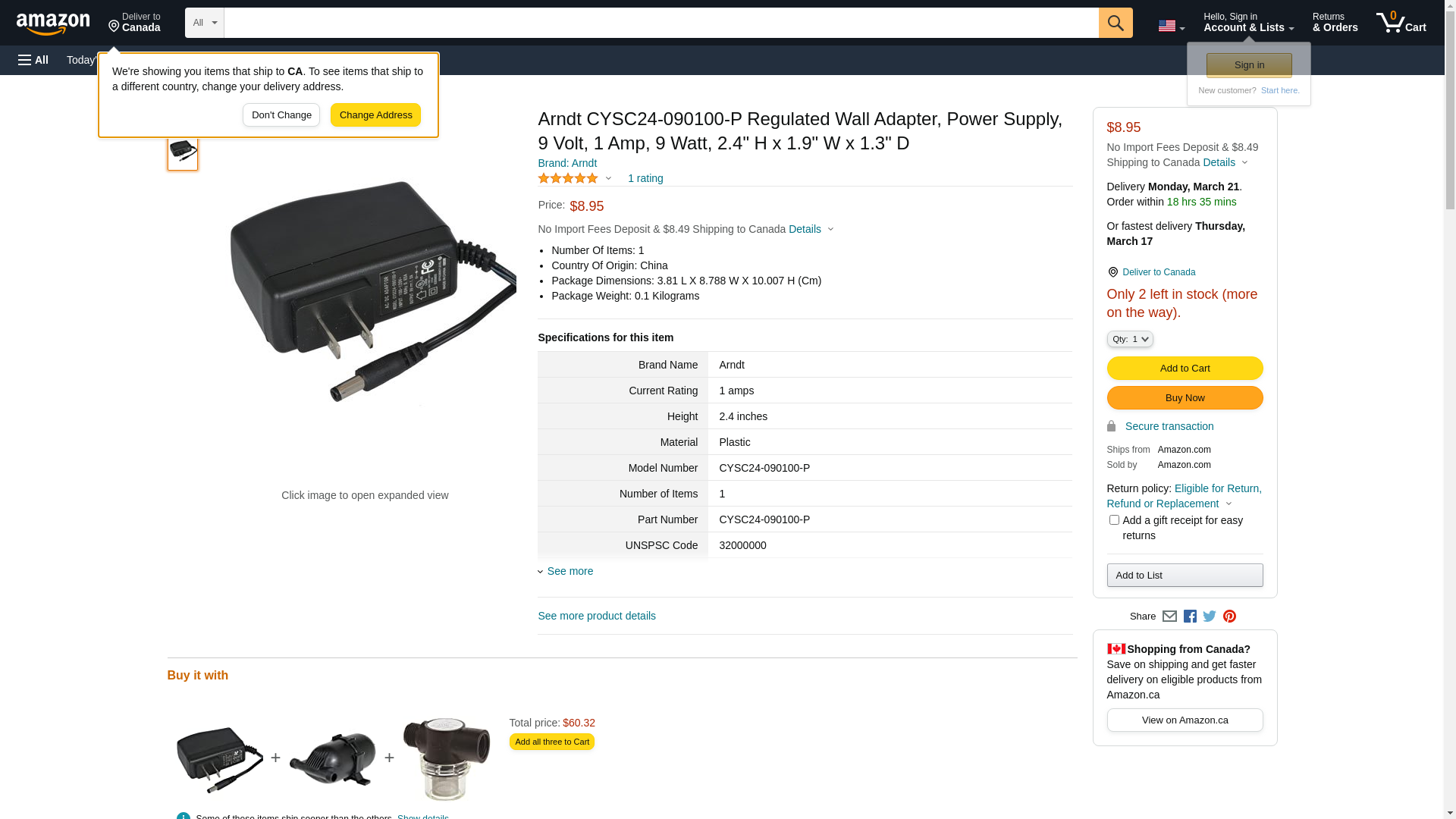 Arndt CYSC24-090100-P Regulated Wall Adapter, Power Supply, 9 Volt, 1 Amp, 9 Watt, 2.4" H x 1.9" W x 1.3" D