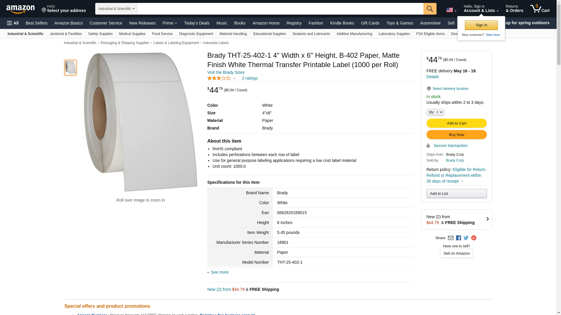 Brady THT-25-402-1 4" Width x 6" Height, B-402 Paper, Matte Finish White Thermal Transfer Printable Label (1000 per Roll)