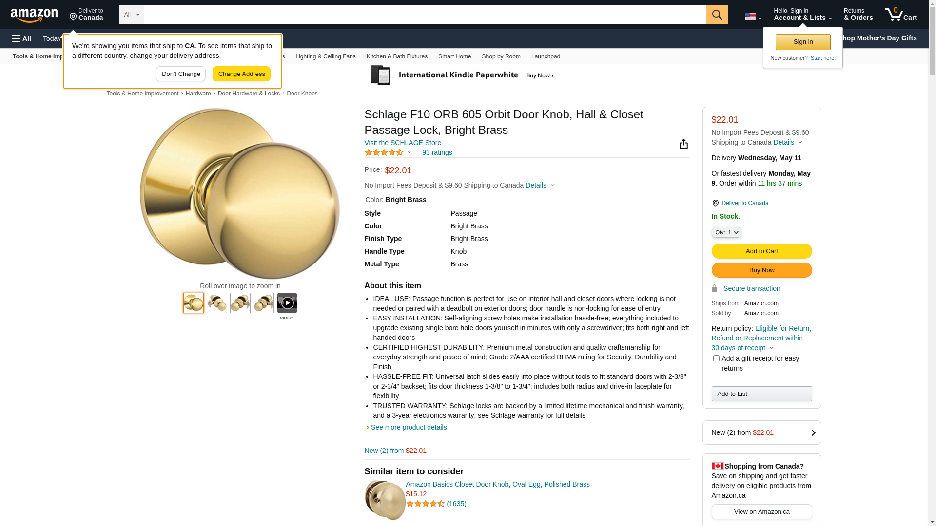 Schlage F10 ORB 605 Orbit Door Knob, Hall & Closet Passage Lock, Bright Brass