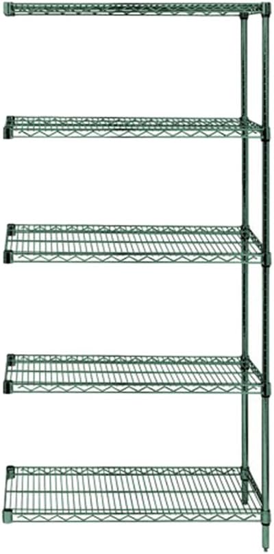 This Proform wire shelving add-on unit has a green epoxy coated finish that is electrostatically applied to carbon steel that has been treated with an iron phosphate. This wire shelving style is ideally suited for wet or moist environments as the shelving finish contains an antimicrobial agent that will not allow the build up of bacteria. This NSF approved shelving system has a 15 year warranty against rust or corrosion.