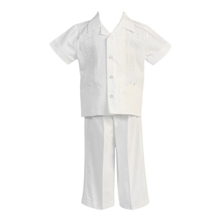 <ul> <li>A new addition to your boy's clothing line from Angels Garment</li> <li>Shirt with diamond pattern embroidered panels and button closure</li> <li>Coordinating pants are included</li> <li>This adorable outfit comes in cotton</li> <li>Sizing is based on U.S. clothing size standards</li> </ul>