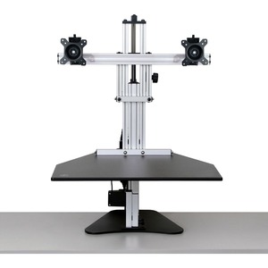 Standing and moving during the day can provide a wide array of health benefits over sitting all day long. This adjustable stand lets you stand for portions of the day, and then sit when you start to tire. Accommodates 2 monitors weighing up to 10 lb and measuring 25" wide (not diagonally) each. VESA mounts have a 75 x 75 or 100 x 100 pattern for easy compatibility. Mounts can tilt, pan and rotate for a great viewing angle from almost anywhere. Slide the mounts horizontally to position the monitors as close together or far apart as desired. Monitors can be adjusted independently of each other. Flush-mounted push button controls the nitrogen gas spring for fast, easy adjustments. Height can be adjusted approximately 14" from your desk surface up to 40 1/2". Steel base offers strength and stability. Includes 1 stabilization leg. Partially assembled.