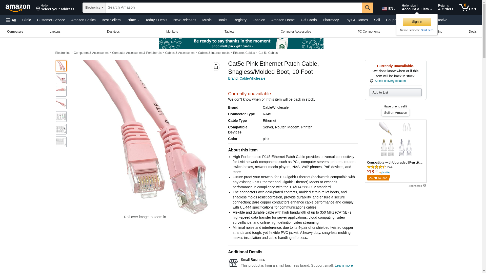 Cat5e Pink Ethernet Patch Cable, Snagless/Molded Boot, 10 Foot