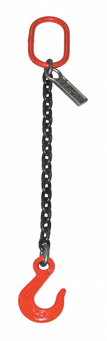 Chain Sling, Grade 100, Number of Sling Legs 1, Chain Size 3/8 in, Sling Capacity @ 90 Degrees 8,800 lb, Sling Type Oblong, Sling Hook, Hook Opening 1 7/16 in, Length of Sling Leg 9.4 ft, Master Link/Bail Overall Height 9 in, Master Link/Bail Opening Height 5 1/2 in, Master Link/Bail Opening Width 2 3/4 in, Color Black, Orange, Finish Chain Black Coating, Fittings Powder-Coated, Sling Length 10 ft, Standards ASME B30.9, NACM, OSHA 1910.184; , Includes Chain Sling Safety Bulletin Rev 2.12