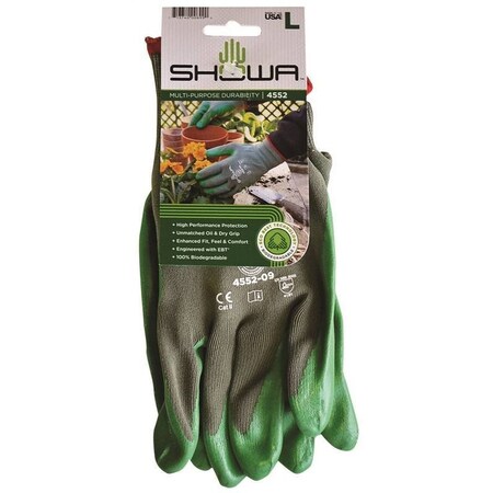 Highlights: Color: Green Gender: Universal Size: Large Material: Nitrile Glove Style: Coated Lined Cuff Style: Elastic Stretchable Contains Latex Number in Package: 1 pair Packaging Type: Carded Machine Washable Nonslip Grip EBT ( Eco Best Technology) Sponge nitrile coating provides good grip in oily and dry conditions